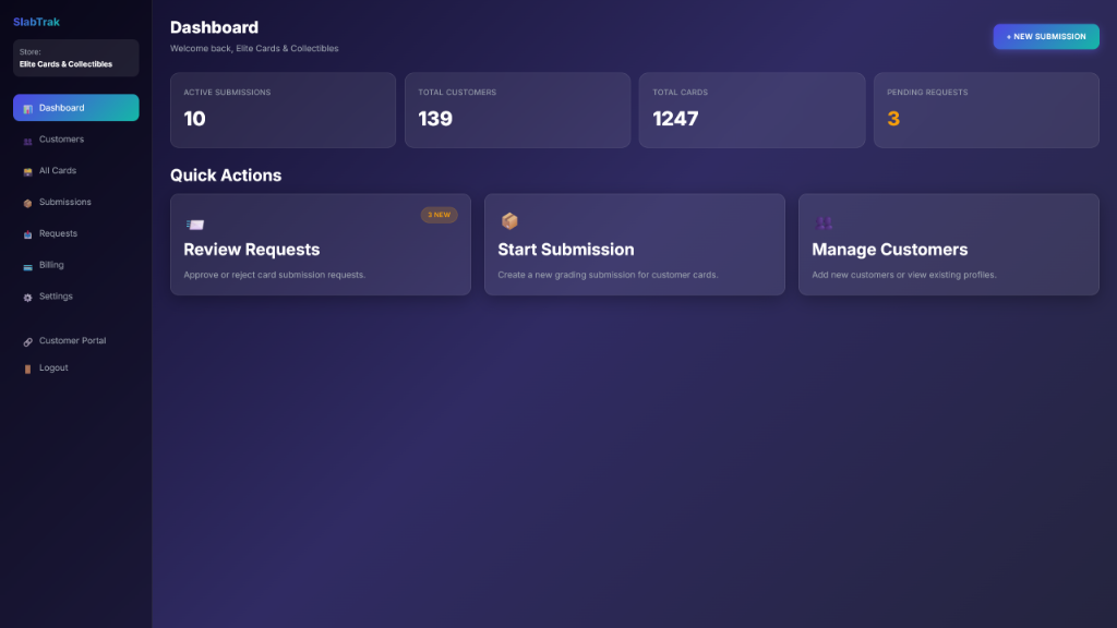 SlabTrak is the professional PSA & SGC submission management platform built specifically for trading card stores. Digitize your entire grading lifecycle from customer intake to completion.